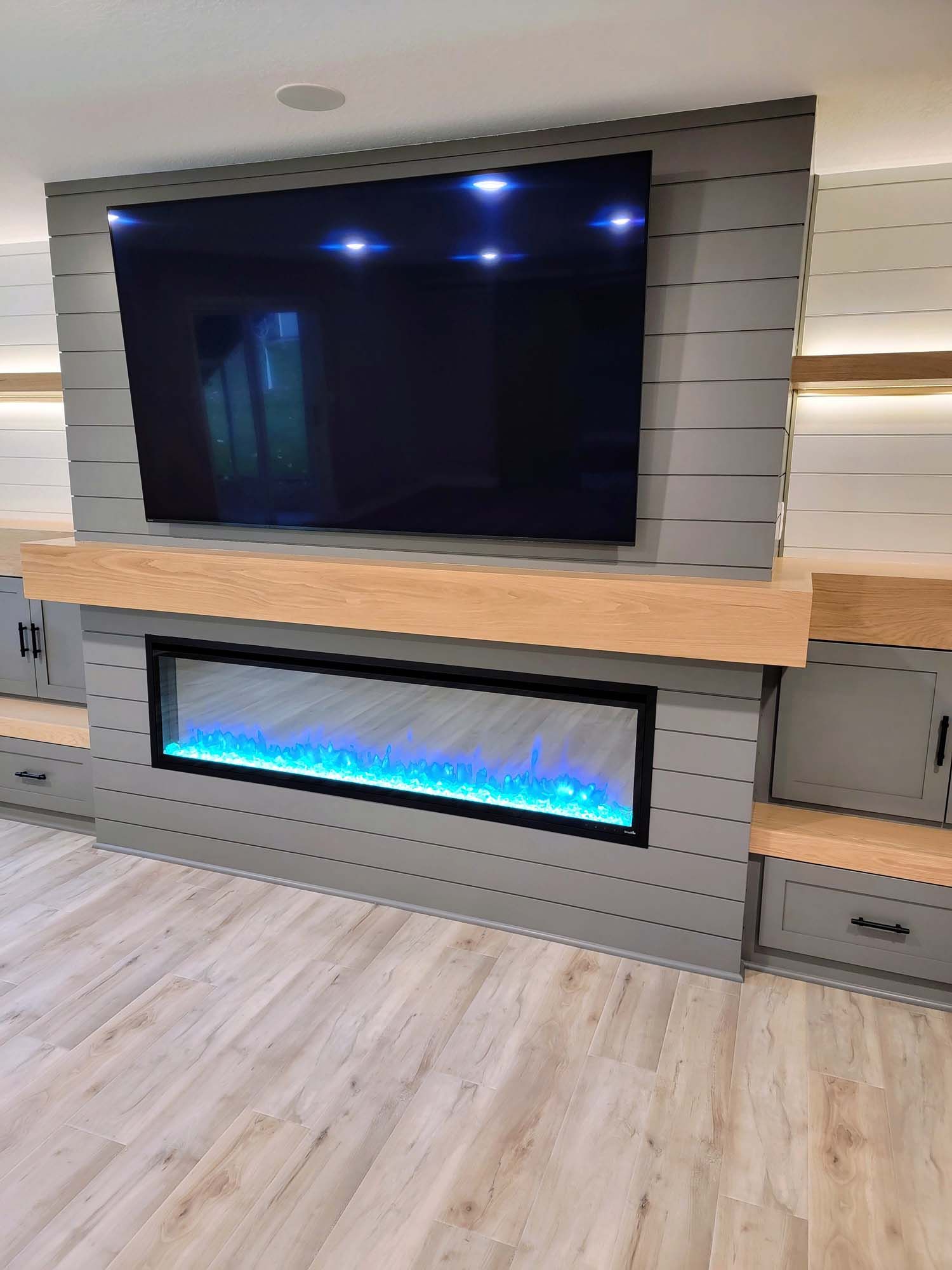 Tv Mounting on shiplap surface above a firplace