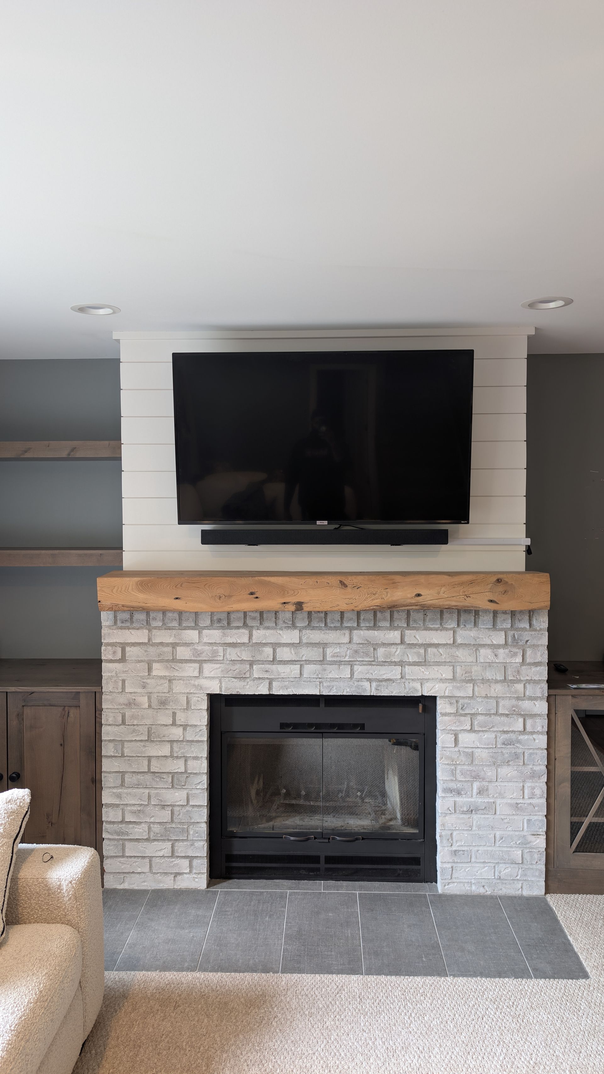 Tv and Soundbar Mounting on shiplap surface above a firplace