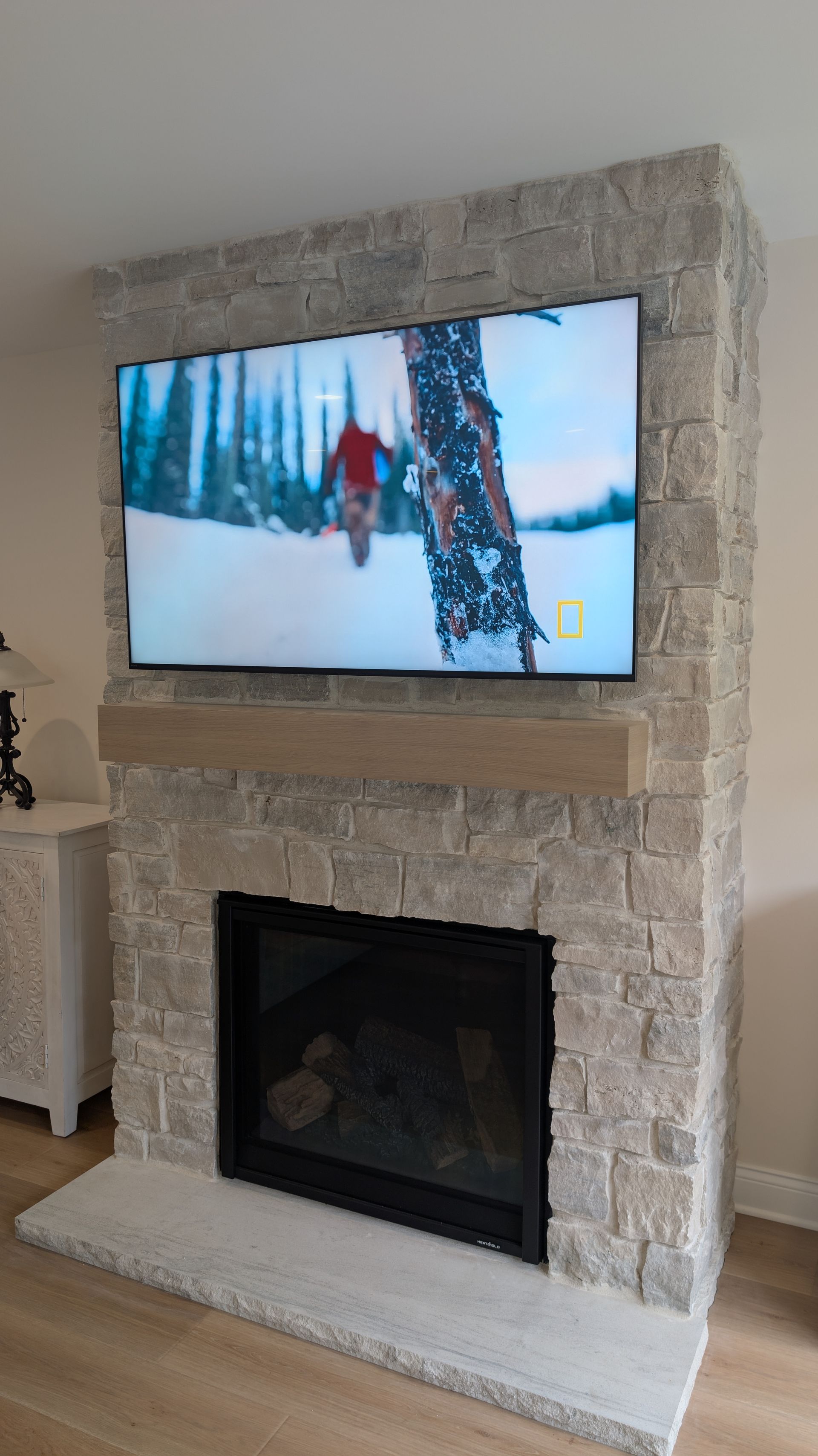 Tv mounted on a real stone surface.